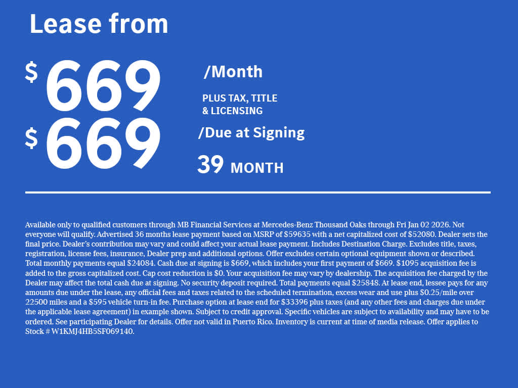 Mercedes-Benz of Thousand Oaks is your local Mercedes-Benz dealership, serving the Thousand Oaks and Los Angeles Metro area since 1982. Our showroom always includes the most current luxurious and sophisticated Mercedes-Benz models. Were only a short trip from many communities, including Malibu and Simi Valley, and our team is happy to provide sales, financing, and automotive service and repair on site.
