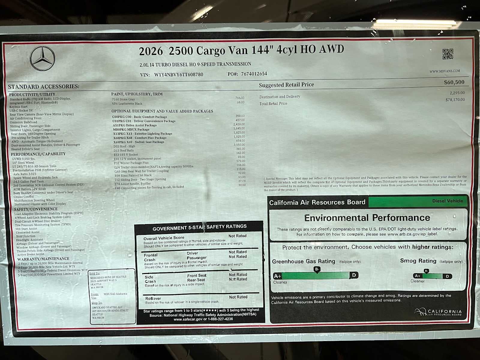 Heated Seats, Onboard Communications System, iPod/MP3 Input, Diesel, All Wheel Drive, WINTER PACKAGE PLUS, FOG LAMP W/CORNERING LIGHT FUNCTION, ACTIVE LANE KEEPING ASSIST. Sprinter Cargo Van trim, Stone Grey exterior and Black interior